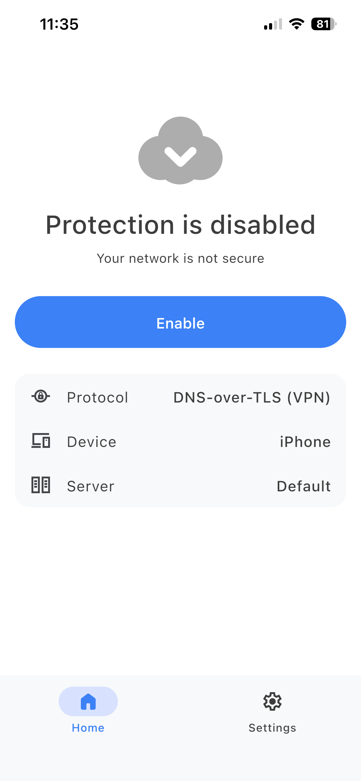 When using a VPN-based protocol, you still need to allow creating a VPN profile before being fully protected. To do this, go to the app’s home page, click Enable, and follow the in-app instructions.