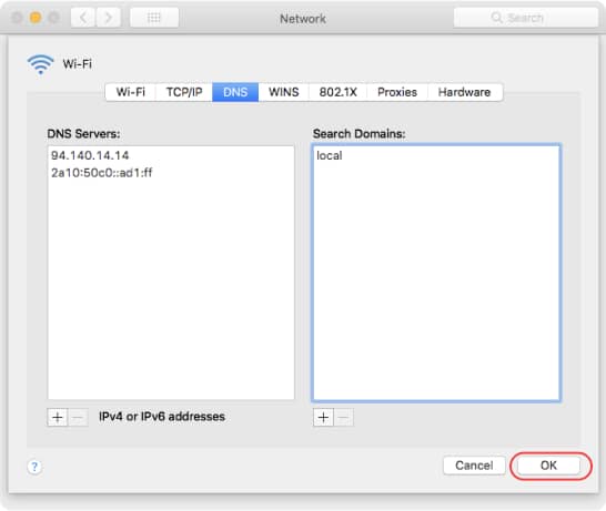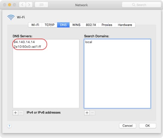 Click the Add button at the bottom of the DNS Servers list. Enter the IPv4 or IPv6 addresses for the required DNS servers from below.
