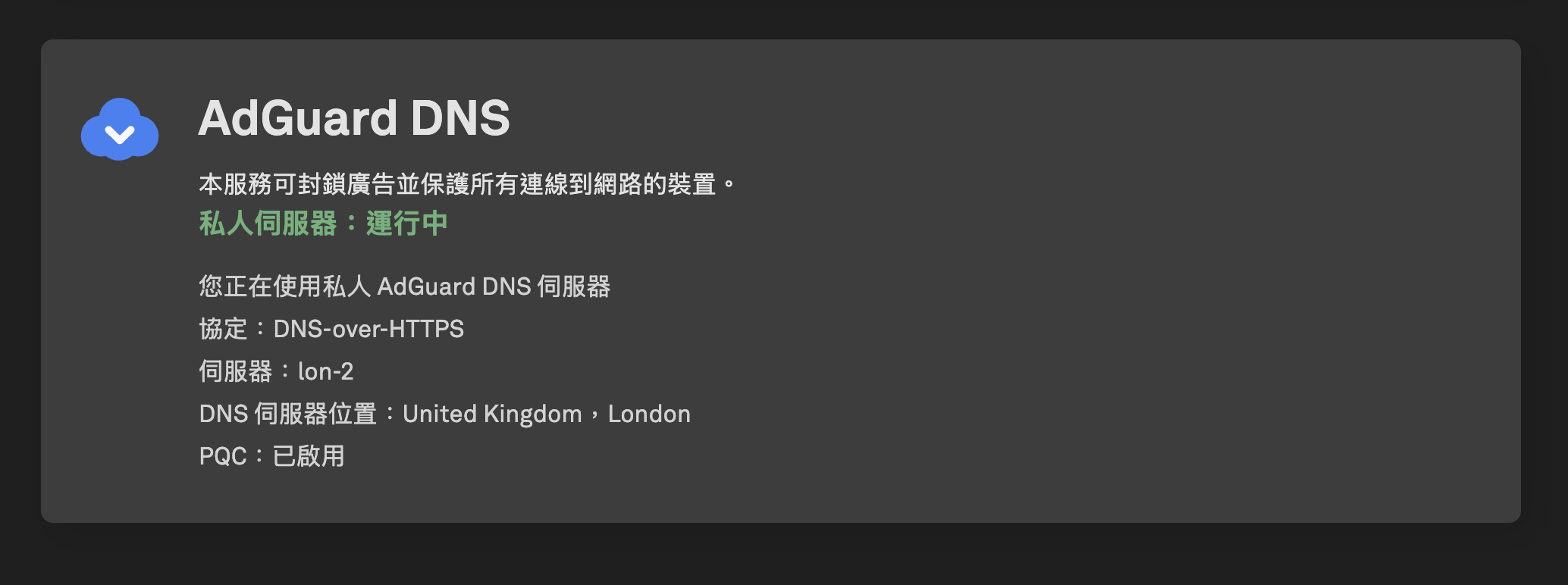 要確認後量子加密是否已啟用,請訪問我們的測試頁面並向下滾動至 AdGuard DNS 部分。當狀態顯示為「PQC: 已啟用」時,即表明您已獲得全面保護。